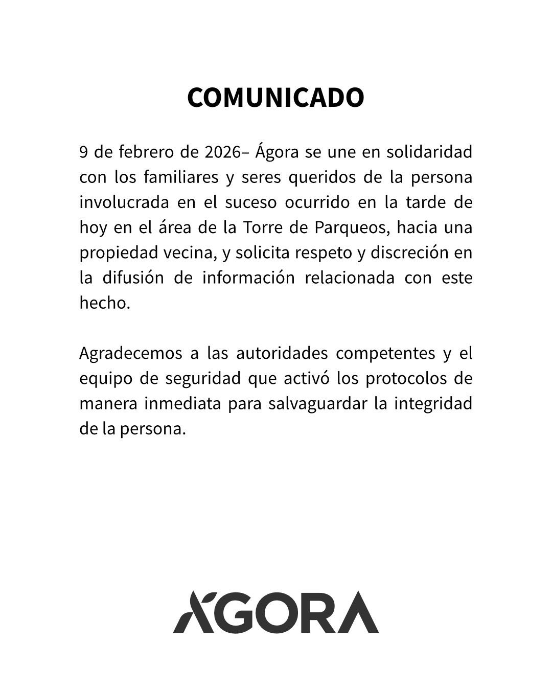 Santo Domingo,.– El centro comercial Ágora manifestó este lunes su solidaridad con los familiares y seres queridos de la persona involucrada en un incidente ocurrido durante la tarde en el área de la Torre de Parqueos, con desplazamiento hacia una propiedad vecina, según informó mediante un comunicado oficial. En el documento, la entidad hizo un llamado respetuoso a los medios de comunicación y a la ciudadanía a manejar con discreción y responsabilidad cualquier información relacionada con el suceso, en consideración a la sensibilidad del caso y al respeto debido a…