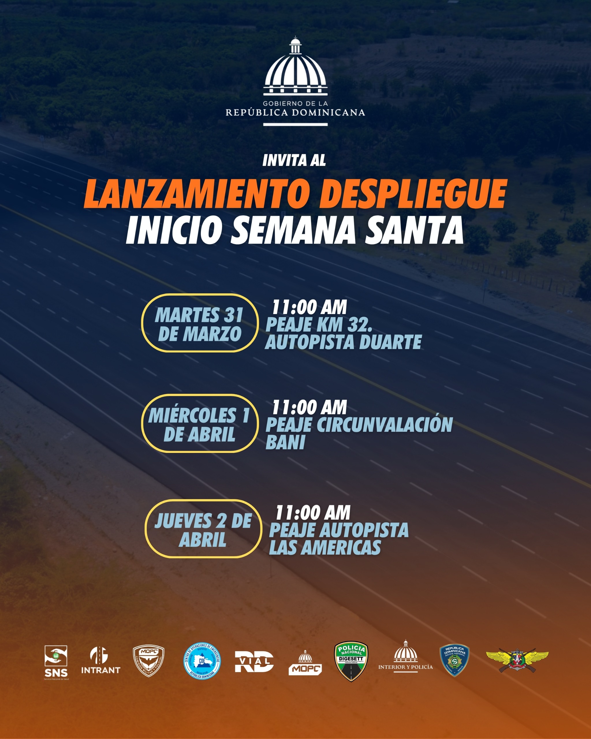Santo Domingo. El Gobierno de la Gobierno de la República Dominicana anunció el inicio de su operativo especial de seguridad vial con motivo de la Semana Santa, mediante una serie de actos de lanzamiento en puntos estratégicos del país. La iniciativa busca reforzar la prevención de accidentes y garantizar la movilidad segura de miles de ciudadanos que se desplazan durante el asueto. El cronograma de despliegue arranca el martes 31 de marzo a las 11:00 de la mañana en el peaje del kilómetro 32 de la autopista Duarte, una de…