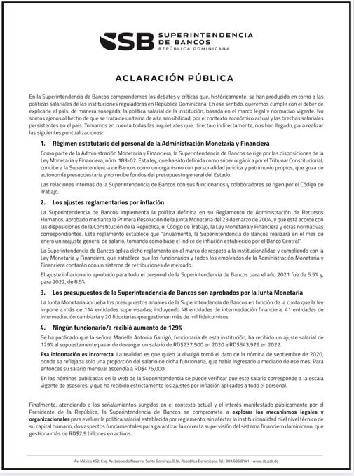 Finalmente, atendiendo a los señalamientos surgidos en el contexto actual y al interés manifestado públicamente por el Presidente de la República, la Superintendencia de Bancos se compromete a explorar los mecanismos legales y organizacionales para evaluar la política salarial establecida por reglamento, sin afectar la institucionalidad ni el nivel técnico de su capital humano, dos aspectos fundamentales para garantizar la correcta supervisión del sistema financiero dominicano, que gestiona más de RD$2,9 billones en activos.