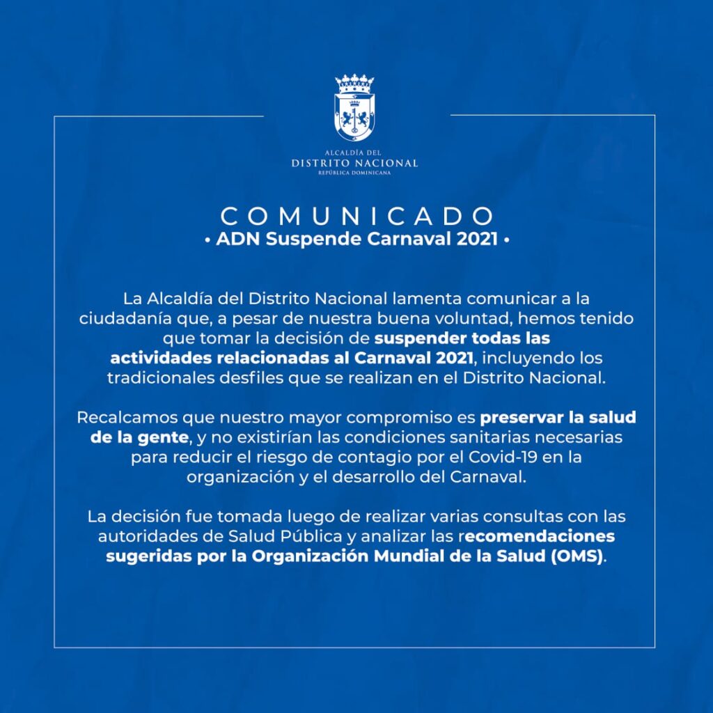 “La Alcaldía del Distrito Nacional lamenta comunicar a la ciudadanía que, a pesar de nuestra buena voluntad, hemos tenido que tomar la decisión de suspender todas las actividades relacionadas al carnaval 2021, incluyendo los tradicionales desfiles que se realizan en el Distrito Nacional”, explica el documento del ADN.