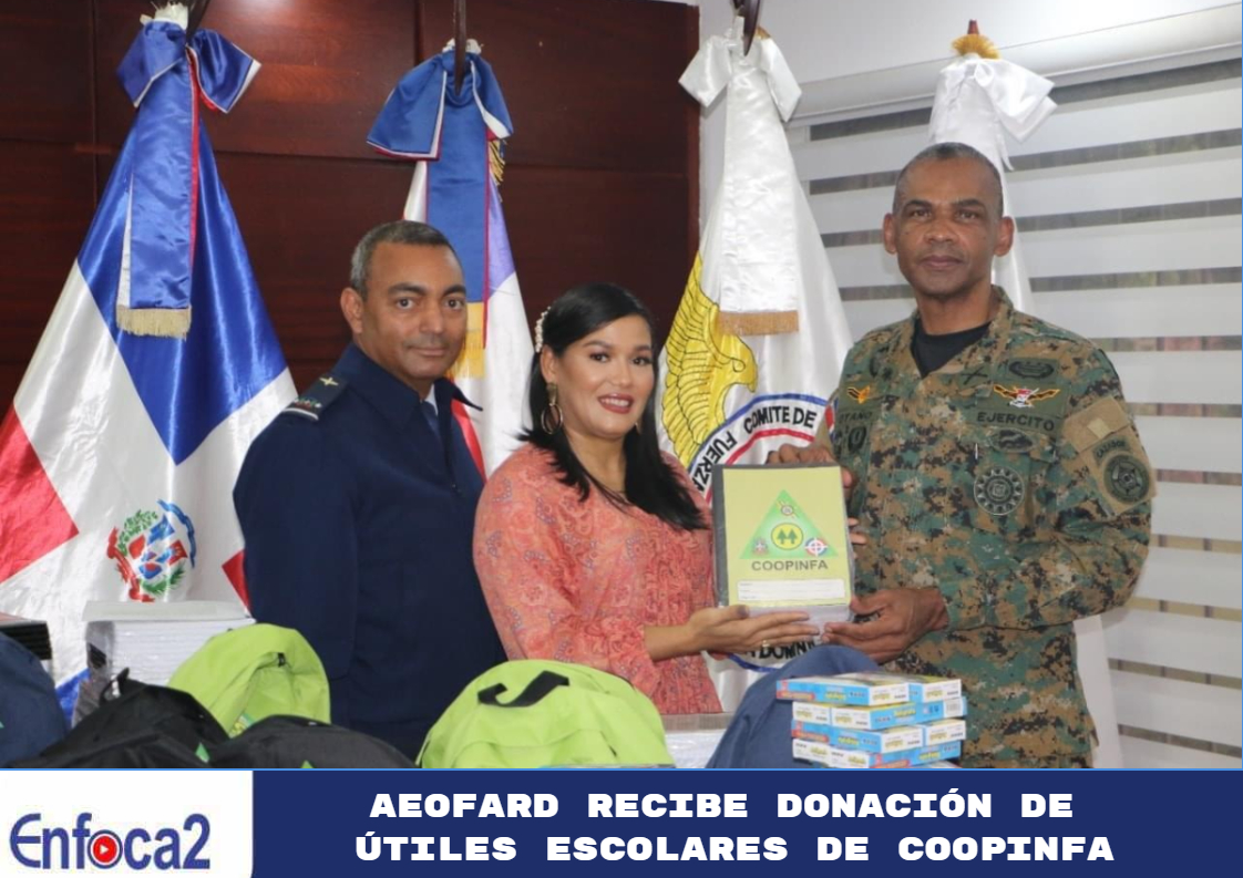 La tarde de este martes, la Asociación de Esposas de Oficiales de la Fuerza Aérea de República Dominicana (AEOFARD) recibió la donación de útiles escolares, por parte de la Cooperativa de Ahorros, Créditos y Servicios Múltiples de las Fuerzas Armadas COOPINFA.