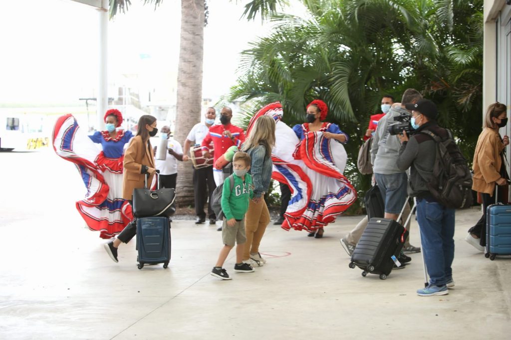 Los primeros pasajeros, post-pandemia, procedentes del país sudamericano, llegaron a República Dominicana en el vuelo 1324, totalmente lleno, con la capacidad permitida por los protocolos de seguridad sanitaria y fueron recibidos por el ballet folclórico del Ministerio de Turismo, dirigido por Oscar Batista.