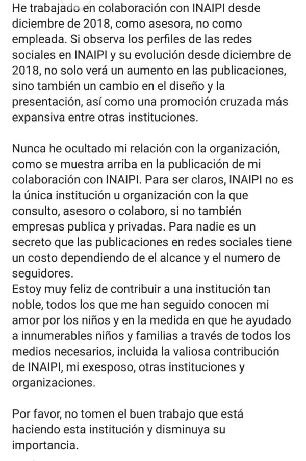 Expresó en una declaración en su cuenta de Instagram con tres millones de seguidores, que ha trabajado en colaboración con Inaipi desde diciembre de 2018, “como asesora, no como empleada”.