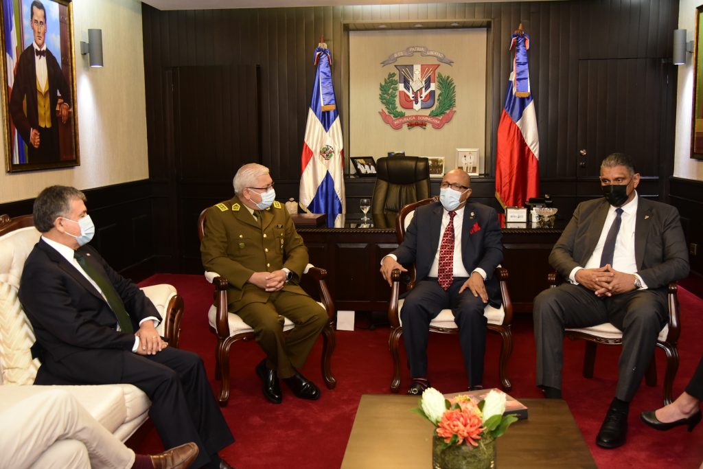 SANTO DOMINGO.- El presidente de la Cámara de Diputados, Alfredo Pacheco, recibió este jueves la visita de cortesía de una delegación de los Carabineros de Chile, encabezada por su director, el general Ricardo A. Yañez Reveco, quien estuvo también acompañado por el ministro de Interior y Policía, Jesús Vásquez Martínez.