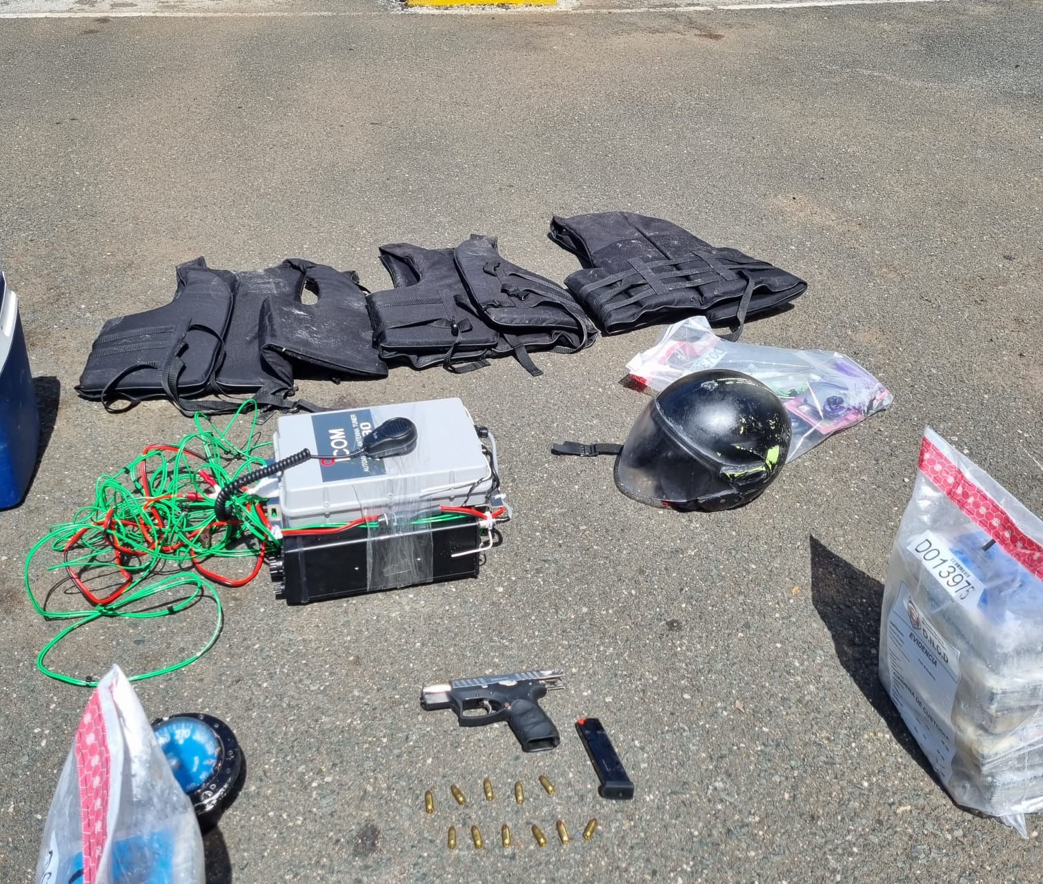 En la operación fue ocupada una pistola calibre nueve milímetros, 23 garrafones de combustibles, un radio de comunicación, una brújula, celulares, un Gps, dos neveritas, comestibles, chalecos salvavidas, ropa impermeable, y otras evidencias.