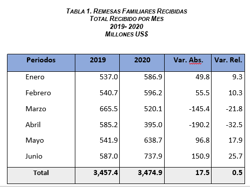 Santo Domingo, República Dominicana. – El Banco Central de la República Dominicana (BCRD) informa que las remesas continúan su ritmo de crecimiento, alcanzando               USD 737.9 millones en el mes de junio, un 25.7% de incremento respecto al mismo mes en 2019, para un total de USD 3,474.9 millones durante el primer semestre del año, un 0.5% por encima del mismo período de 2019.