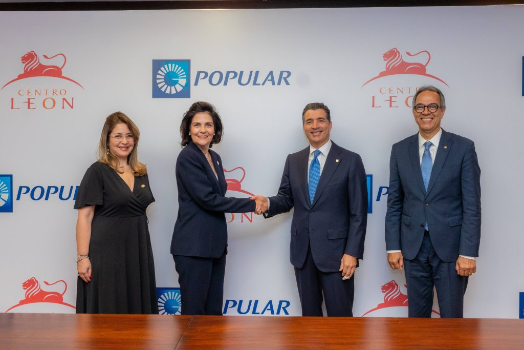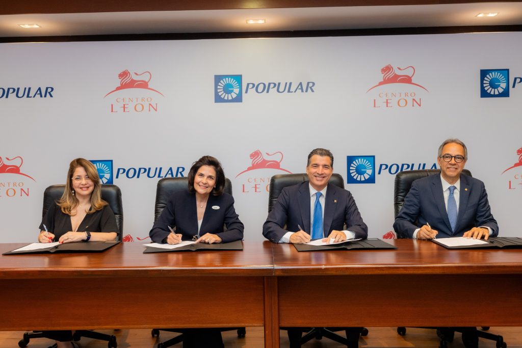 El acto de firma tuvo lugar en la Torre Popular, encabezado por los señores Christopher Paniagua, presidente ejecutivo del Banco Popular, y María Amalia León, presidente de la Fundación Eduardo León Jimenes y directora general del Centro León.