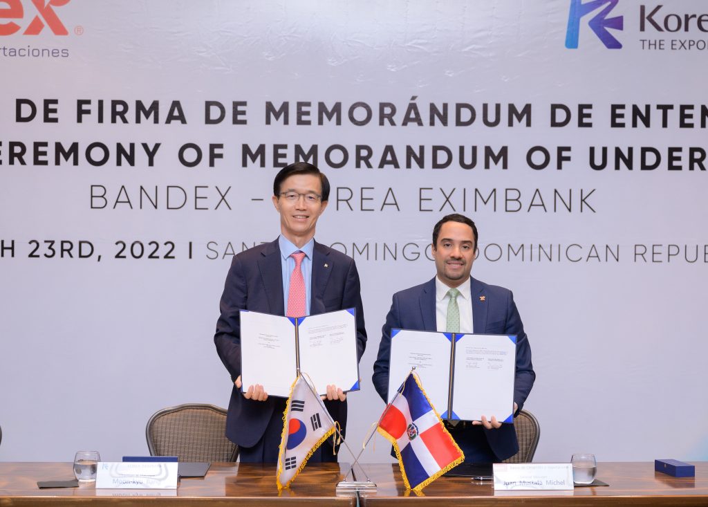SANTO DOMINGO- El Banco Nacional de las Exportaciones (BANDEX) y el Export-Import Bank of Korea (Banco de Exportación e Importación de Corea) firmaron un memorando de entendimiento para promover la cooperación económica y oportunidades de desarrollo empresarial de importación y exportación de bienes y servicios entre ambos países por un monto de hasta 100 millones de dólares.