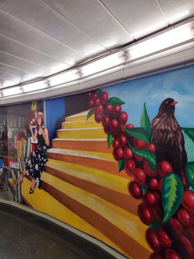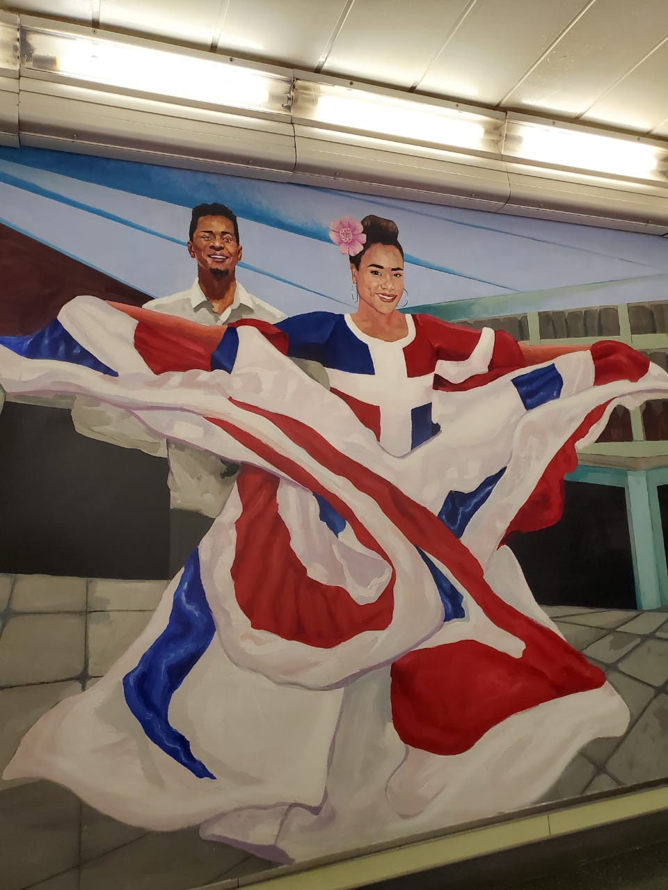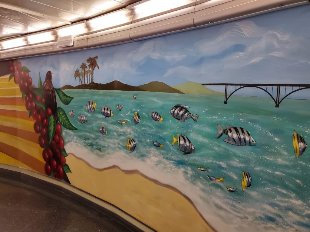 MADRID, España. El Banco de Reservas inauguró un mural que resalta elementos de la dominicanidad en la estación Santo Domingo del Metro de Madrid, parte del programa cultural que desarrolla en la Feria FITUR 2022), que inicia este miércoles del 19 al 23,