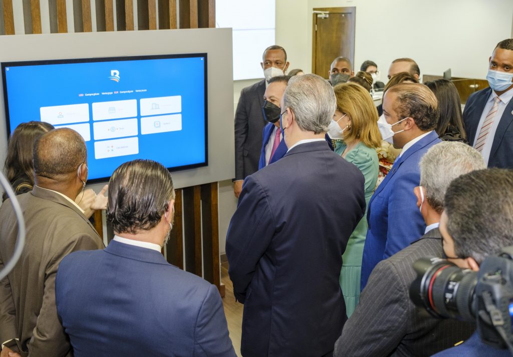 El presidente Luis Abinader; la vicepresidenta, Raquel Peña; y el gobernador del Banco Central, Héctor Valdez Albizu, encabezaron la apertura de la Oficina Dual junto al administrador general de la entidad financiera, Samuel Pereyra, quien les mostró las funcionalidades y facilidades que esta oficina comercial ofrece a sus clientes.