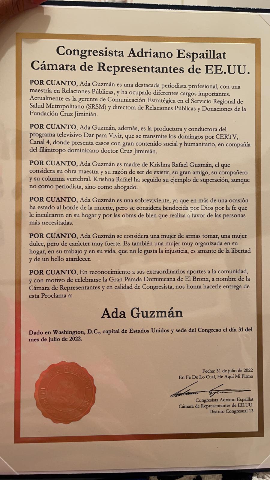 “En reconocimiento a sus extraordinarios aportes a la comunicación y al pueblo dominicano, a nombre de la Cámara de Representantes y en calidad de Congresista, nos honra hacerle entrega de esta proclama a la periodista Ada Guzmán”, expresa el documento entregado.
