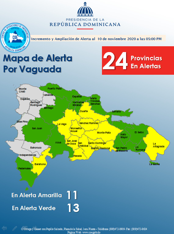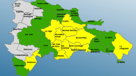 Las provincias en alerta amarilla son: El Gran Santo Domingo, La Altagracia, San Cristóbal, San José de Ocoa, Monseñor Nouel, Sánchez Ramírez, Barahona, La Vega, Peravia, Monte Plata, Provincia Duarte, en Bajos de Yuna.