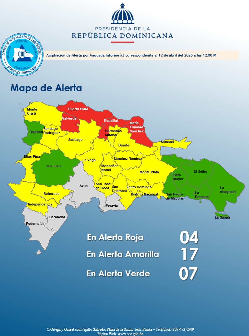 En cuanto a las condiciones meteorológicas, el COE explicó que se prevé la continuidad de las precipitaciones durante las próximas horas, con aguaceros moderados a fuertes, ráfagas de viento y posibles tormentas eléctricas, especialmente en regiones del norte, noreste, sureste y la cordillera Central. Las autoridades exhortaron a la ciudadanía a mantenerse atenta a los boletines oficiales y seguir las recomendaciones de los organismos de protección civil para evitar pérdidas humanas.