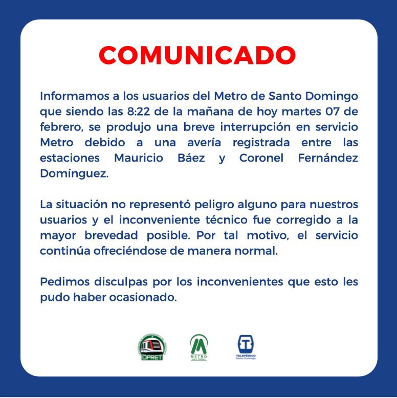 Informamos a los usuarios del Metro de Santo Domingo que siendo las 8:22 de la mañana de hoy martes 07 de febrero , se produjo una breve interrupción en servicio Metro debido a una avería registrada entre las estaciones Mauricio Báez y Coronel Fernández Domínguez.