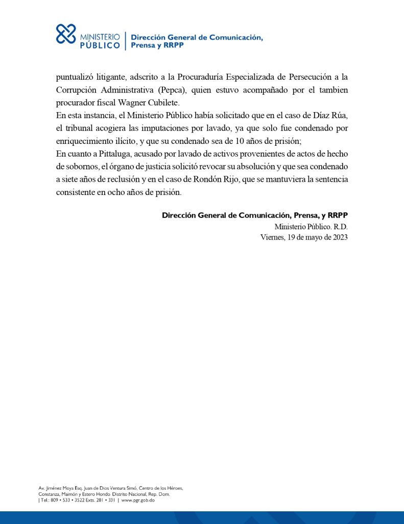 En cuanto a Pittaluga, acusado por lavado de activos provenientes de actos de hecho de sobornos, el órgano de justicia solicitó revocar su absolución y que sea condenado a siete años de reclusión y en el caso de Rondón Rijo, que se mantuviera la sentencia consistente en ocho años de prisión.