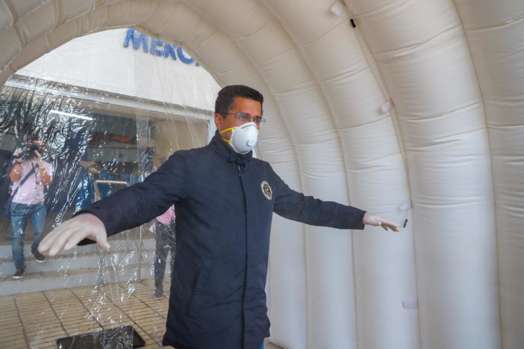 Collado anunció que este es el primero de 10 túneles que se instalarán en diferentes mercados y puntos de gran afluencia de personas en la capital como medida para contrarrestar la propagación del COVID 19 en la ciudad.