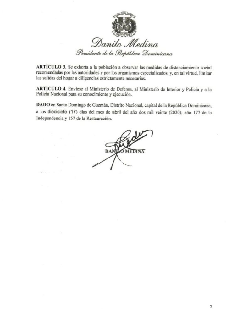 [Decreto 151-20] Presidente Danilo Medina extiende el toque de queda de 5:00 p.m. a 6:00 a.m. en todo el territorio nacional hasta el viernes 30 de abril de 2020.