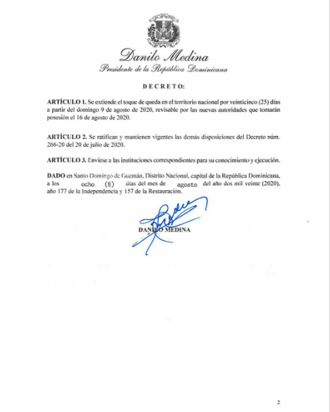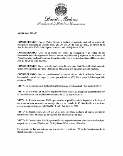 [Decreto 298-20] Presidente Danilo Medina extiende el toque de queda en todo el territorio nacional por 25 días a partir del 9 de agosto de 2020, revisable por las nuevas autoridades que tomarán posesión el 16 de agosto de 2020.