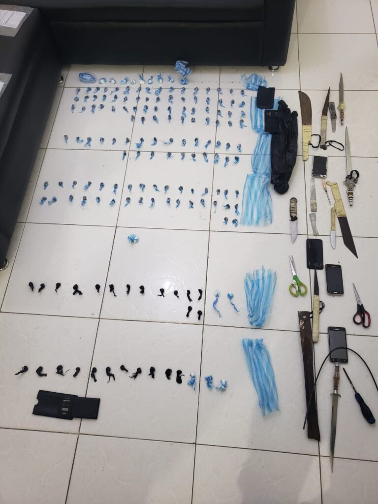 Las autoridades localizaron 314 armas blancas de diferentes pulgadas, 22 tijeras de diferentes diámetros, dos relojes inteligentes, 127 celulares de diferentes marcas y colores, 50 chips para celulares, 117 radios AM–FM y 25 dispositivos de amplificación de música.