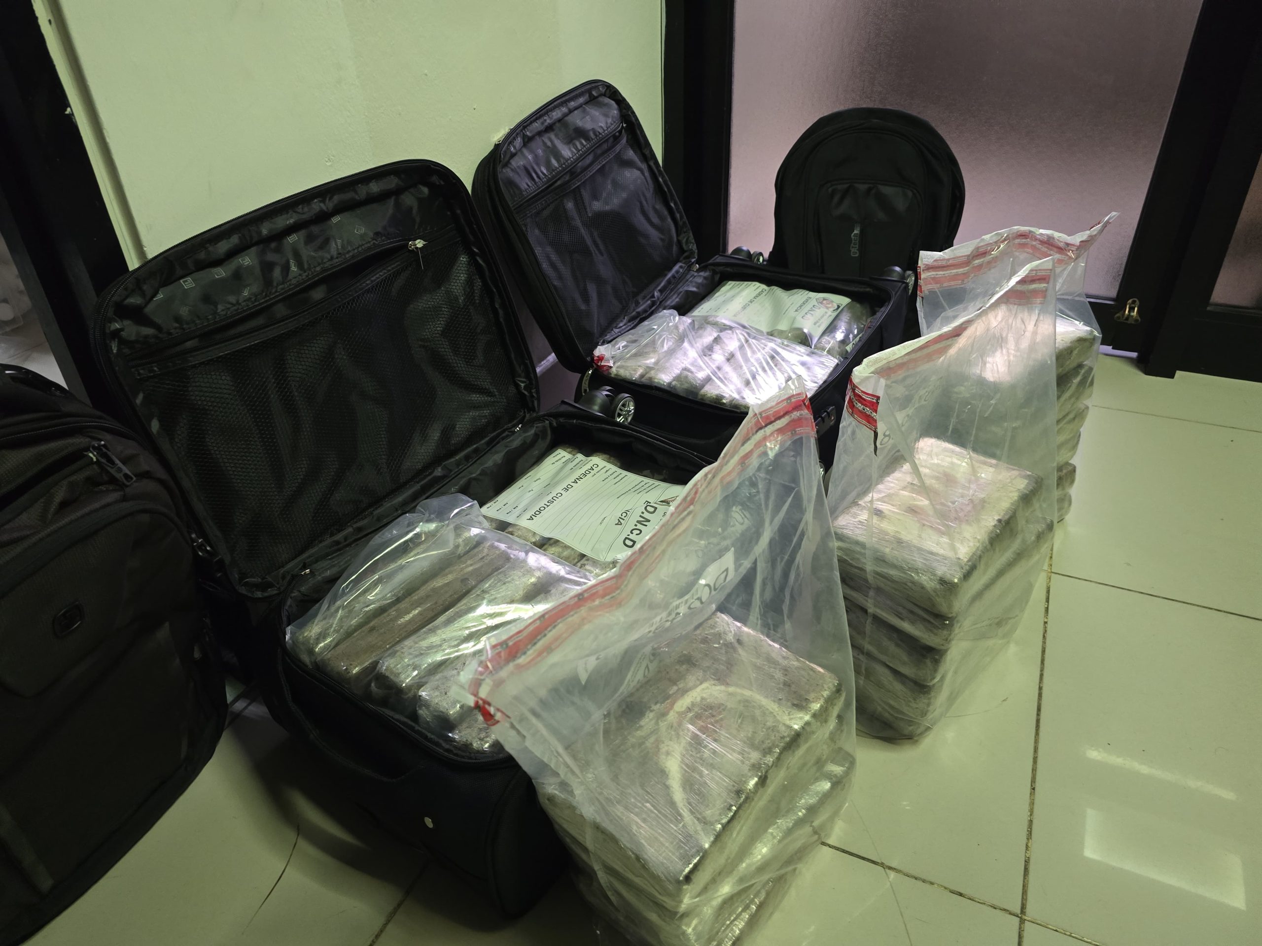 De acuerdo con el informe oficial, los agentes detectaron irregularidades en el equipaje de los sospechosos mediante equipos de rayos X en el área de salidas de la terminal. Tras una inspección más detallada y en presencia de un fiscal del Ministerio Público, se procedió a la apertura de dos mochilas y dos maletas, donde fueron hallados los paquetes, envueltos en cinta adhesiva y con distintos distintivos.