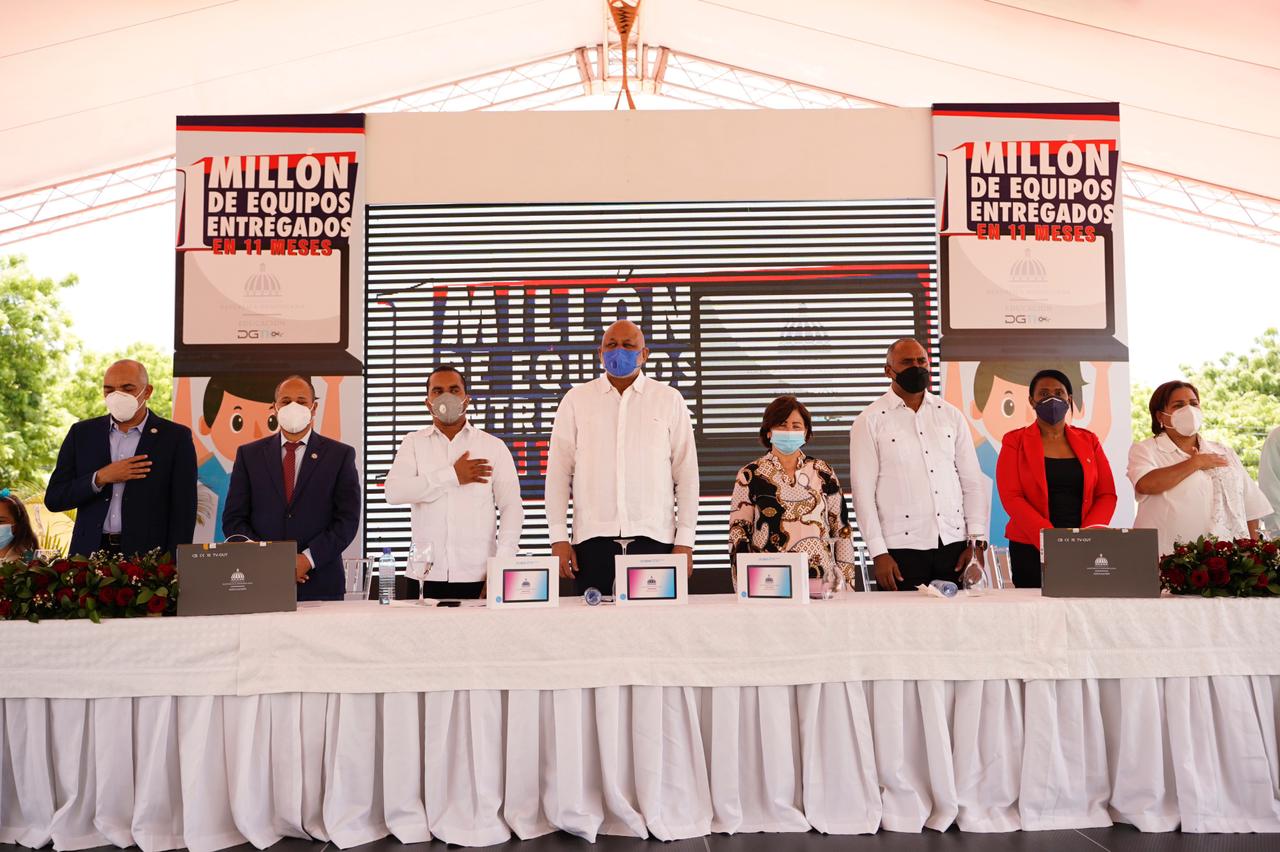 Baní, Peravia.- El ministerio de Educación alcanzó la cifra de un millón de dispositivos tecnológicos entregados a los alumnos del sistema de educación preuniversitaria, en un emotivo acto celebrado en la escuela Máximo Gómez, de Bani, encabezado por el ministro Roberto Fulcar, quien celebró la buena marcha del proceso que busca disminuir la brecha digital.