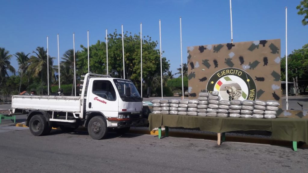 SANTO DOMINGO, RD.- Los paquetes fueron decomisados en el Puesto de Chequeo Militar Cruce de Vicente Noble, perteneciente a la 5ta. Brigada de infantería del Ejército en Barahona, y eran transportados en el camión marca Mitsubishi, color blanco, placa no. L162454, donde fueron detenidos sus ocupantes, los señores Carlos Estarlin Reyes Rojas cédula 227-0002236-5 y Luis Miguel Tejada Sánchez, cédula 223-0092358-2, procedentes de la provincia de Neyba; los 100 paquetes de un peso aproximado de 1,015 libras estaban camuflados debajo de una carga de plátanos, la simulada carga de plátanos iba ser supuestamente vendida en la ciudad capital.