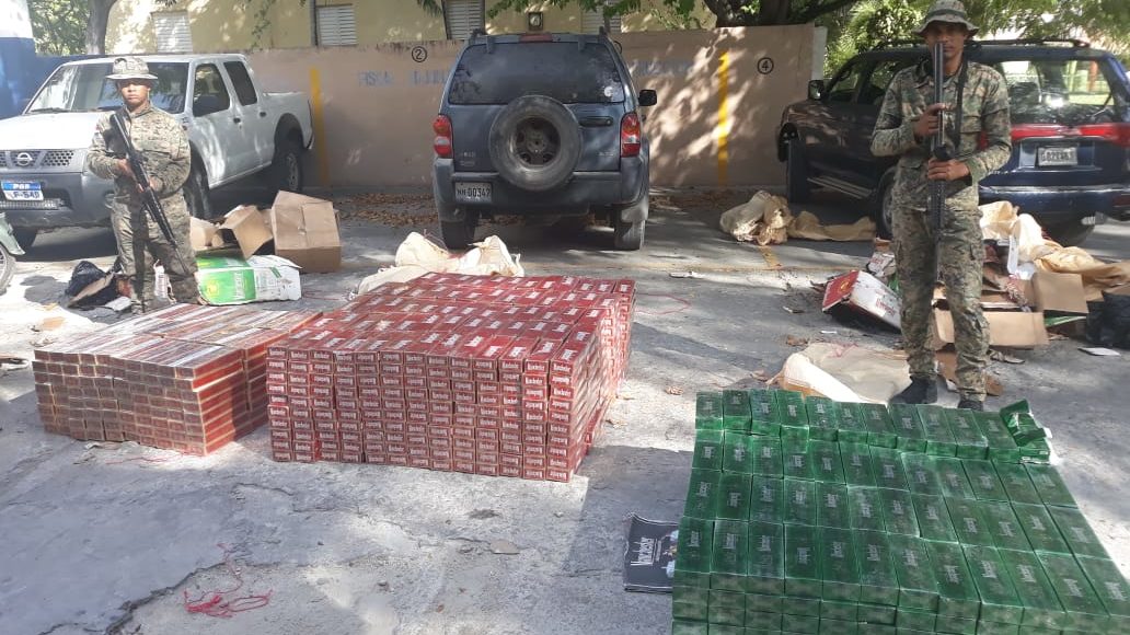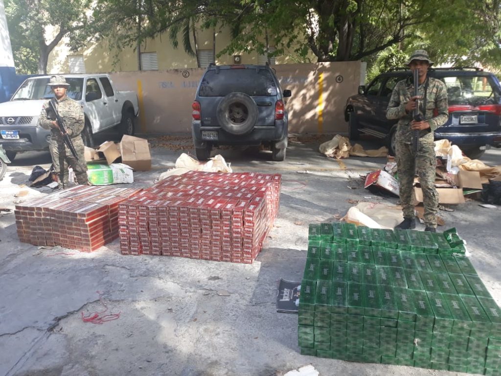 SANTO DOMINGO, RD.- El Ejército continúa dando duros golpes al contrabando y a la delincuencia, cuando con labores de inteligencia miembros de la institución, adscrito a la 5ta. Brigada de Infantería, ERD., allanaron junto a la Magistrada Fiscal de la Provincia de Neyba, el negocio Valeo Cars Wahs, ubicado en la calle Filipinas de ese municipio, donde fue detenido el ciudadano Ángel Manuel Suero Montilla, ocupándosele en el interior del negocio 997 paquetes de cigarrillos marca Manchester y 240 paquetes marca Capital para un contenido total de 247,400 unidades, mercancía de procedencia extranjera, que ingresó al país de contrabando.