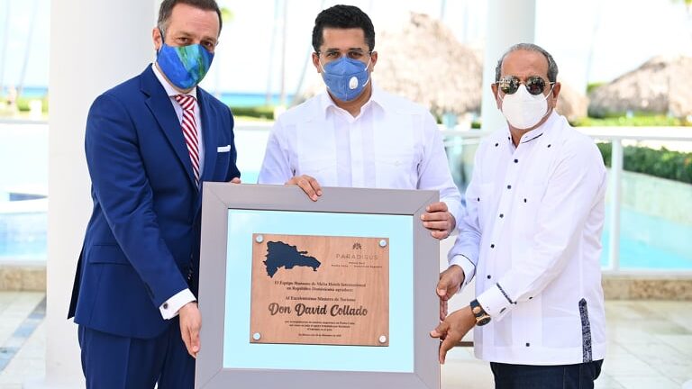 Bávaro, Punta Cana. – En agradecimiento al apoyo brindado al sector hotelero y a su indetenible empeño por la recuperación del turismo del país, el Grupo Meliá reconoció al ministro de Turismo, David Collado, en el marco de la reapertura oficial de uno de sus hoteles.
