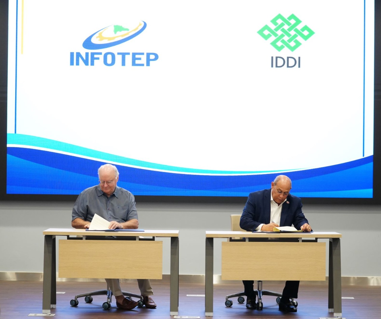El director general del INFOTEP, Rafael Santos Badía, y el director ejecutivo del IDDI, David Luther, firmaron un acuerdo mediante el cual ambas entidades se comprometen, a través de la formación, a propiciar una cultura de reciclaje y aprovechamiento de los residuos, con enfoque de emprendimiento, a través de la economía circular.