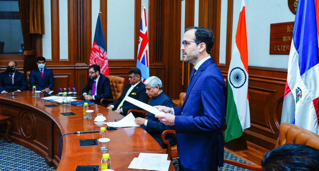 NUEVA DELHI – El Embajador de la República Dominicana en la República de la India, S.E. David Puig, presentó el 18 de marzo de 2021,sus cartas credenciales al presidente de la India, S.E. Ram Nath Kovind, en una ceremonia en modalidad virtual, según el protocolo establecido por el gobierno de la India en el marco de la presente crisis sanitaria.
