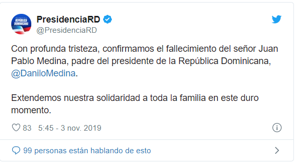 La información la confirmó la Presidencia de la República Dominicana a través de la cuenta oficial de Twiiter.