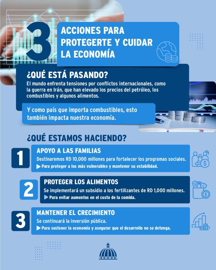 Por su parte, el presidente Luis Abinader aseguró recientemente que el país cuenta con mecanismos para enfrentar las presiones externas. Entre las medidas anunciadas figuran el monitoreo de precios y la reactivación de subsidios, incluyendo un apoyo inicial de mil millones de pesos para fertilizantes, como parte de la estrategia gubernamental para contener el impacto del encarecimiento del petróleo y los alimentos.