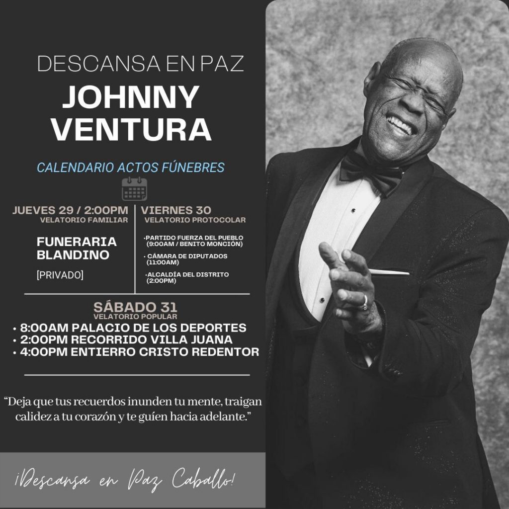 Los restos del popular merenguero dominicano Johnny Ventura, fallecido este miércoles a los 81 años de edad, fueron trasladados desde la ciudad de Santiago hasta la Funeraria Blandino de la avenida Abraham Lincoln, en el Distrito Nacional, de Santo Domingo, donde serán expuestos este jueves desde las 1:30 de la tarde.