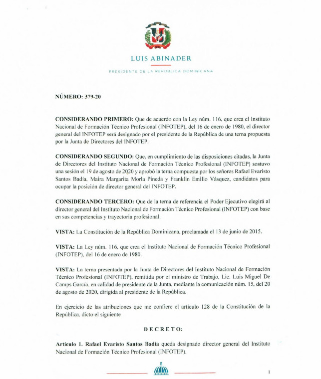 Santo Domingo.- El presidente Luis Abinader designó a Rafael Santos Badía como el nuevo director general del Instituto Nacional de Formación Técnico Profesional (INFOTEP), en sustitución de Rafael Ovalles.