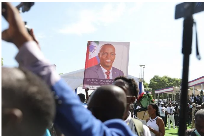 Cherizier vestía un traje blanco y corbata negra al hablar ante la multitud en el barrio pobre costero de La Saline, en la capital Puerto Príncipe. Se escuchaba música proveniente de una camioneta en las inmediaciones cuando él se arrodilló ante un enorme retrato de Moïse y comenzó a encender velas.