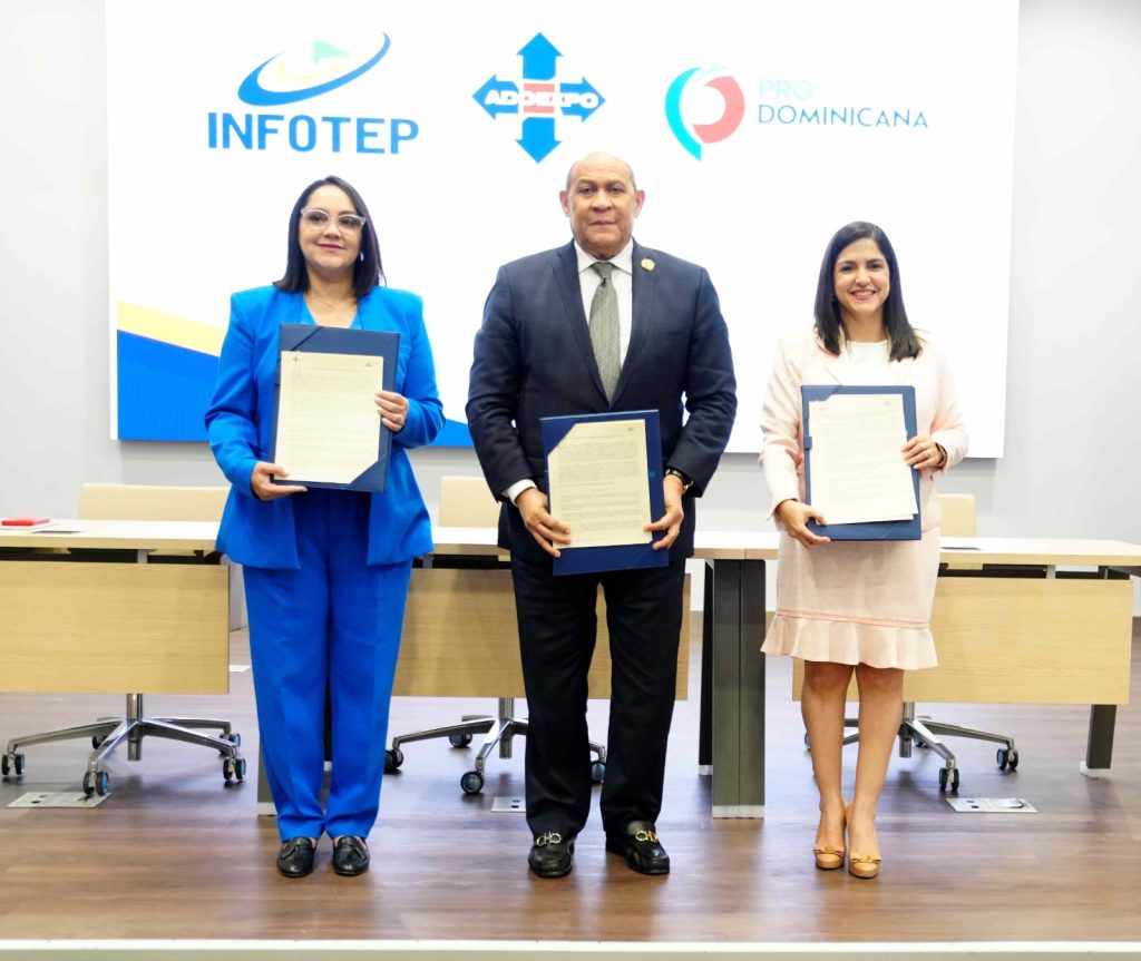Los acuerdos fueron firmados por Rafael Santos Badía, director general del INFOTEP; Biviana Riveiro, directora de PRODOMINICANA, y Elizabeth Mena, presidenta de la Junta Directiva de ADOEXPO.