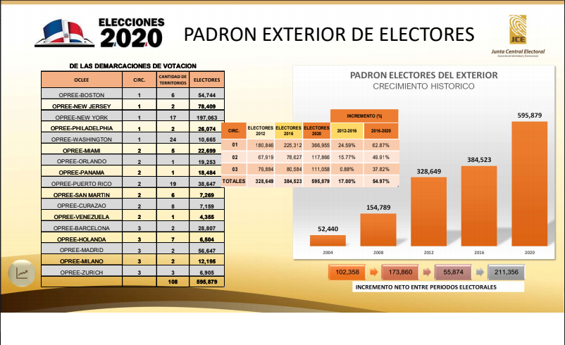 Santo Domingo,RD.- La Junta Central Electoral (JCE) presentó este martes el crecimiento histórico del padrón del exterior con un total de 595,879 electores inscritos en las 3 circunscripciones, y de los cuales 211,356 pertenecen a empadronamientos realizados entre los años 2016 y 2020.