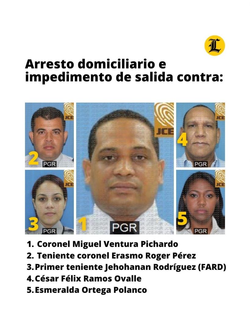 Contra el Coronel Miguel Ventura Pichardo (FARD), el teniente coronel Erasmo Roger Pérez Núñez(FARD), la primer teniente Jehohanan Lucía Rodríguez Jiménez, el primer teniente César Félix Ramos Ovalle y Esmeralda Ortega Polanco, la jueza impuso arresto domiciliario e impedimento de salida.