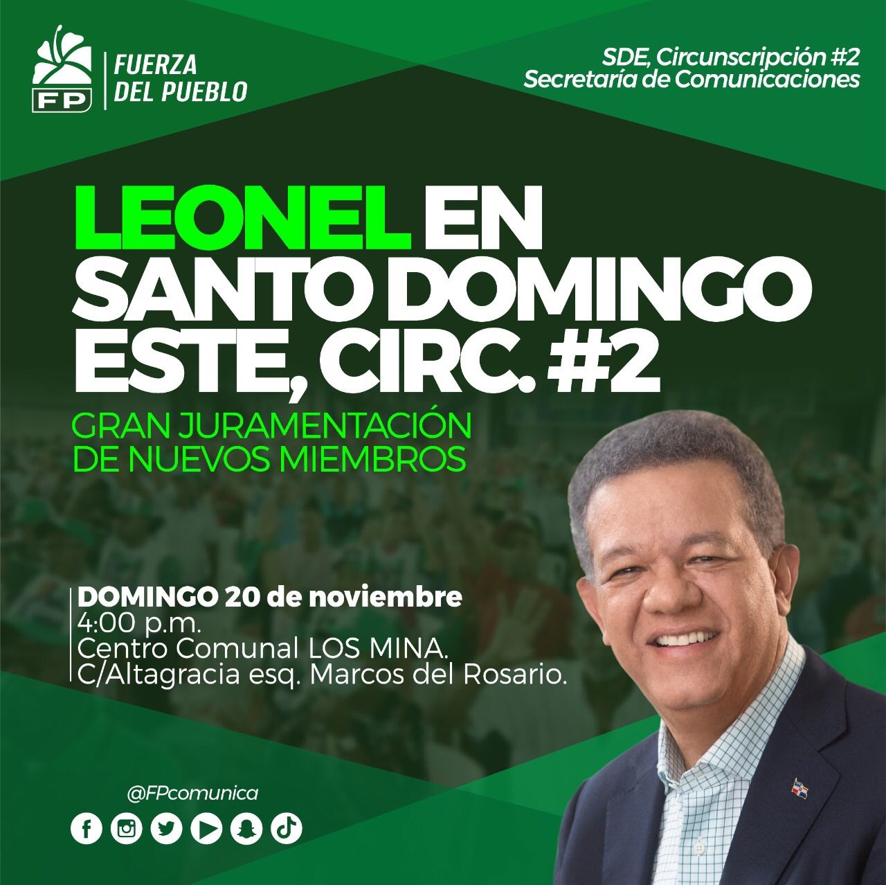 El nuevo acto de juramentación de la FP en Santo Domingo Este se llevará a cabo a las 4:00 de la tarde, del próximo domingo 20 de noviembre, en el Centro Comunal del sector Los Mina, ubicado en la calle Altagracia, esquina Marcos del Rosario, informó la Secretaría de Comunicaciones de la joven organización política opositora.