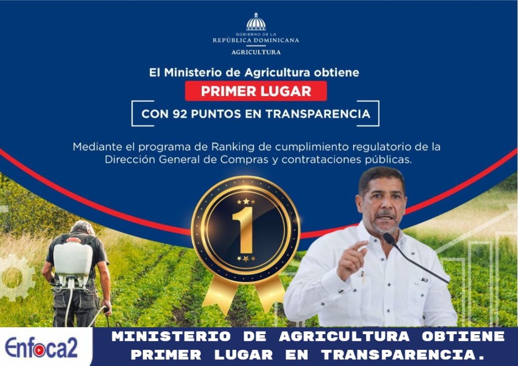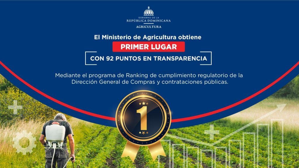 Santo Domingo.- El Ministerio de Agricultura obtuvo el primer lugar en transparencia, entre nueve instituciones evaluadas por la Dirección General de Contrataciones Públicas, logrando un total de 92 puntos de un ranking máximo de 100, donde fue tomado en cuenta el estricto desempeño y el compromiso del cumplimiento regulatorio en las compras y contrataciones públicas del Estado dominicano.