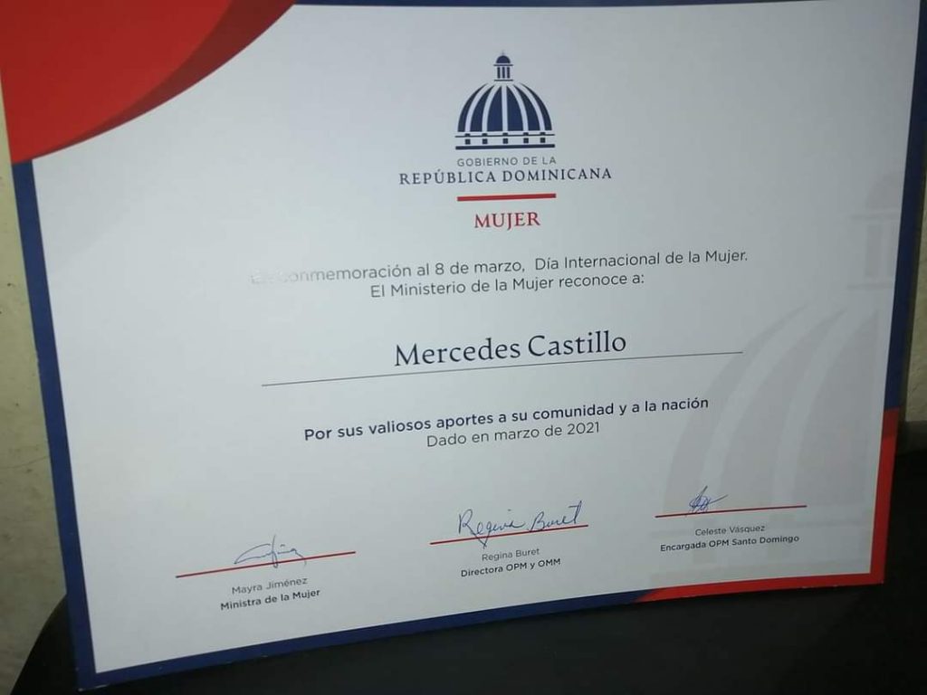 “Gracias al Ministerio de la Mujer por otorgarme el presente reconocimiento. Gracias a la ministra de la Mujer, Mayra Jiménez, a la directora municipal y regional del ministerio, Regina Buret, a la gobernadora de la provincia Santo Domingo, Julia Drullard, a la viceministra de la Mujer. Gracias a todas por valorar el trabajo que realizamos al frente del CDP. Bendiciones”, declaró la gremialista.