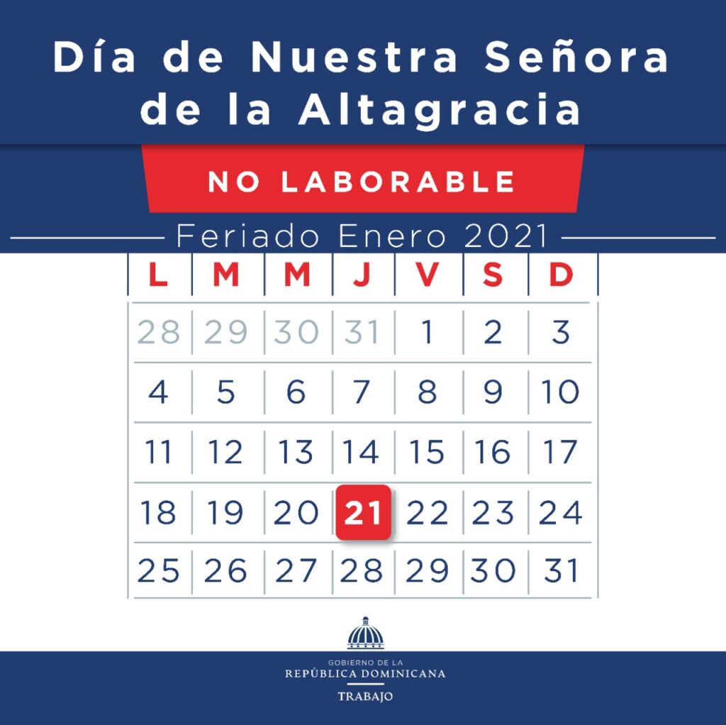 Santo Domingo.-El Ministerio de Trabajo reitera a toda la colectividad empresarial y trabajadora del país que el “Día de la Altagracia”, festividad religiosa que se celebra el jueves 21 de enero, no se cambia.