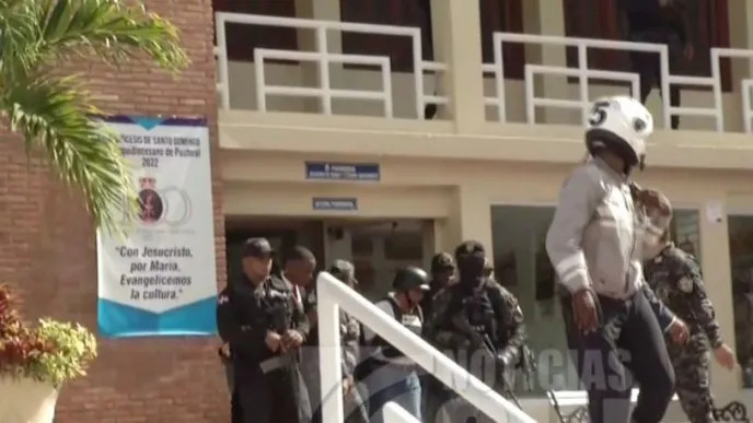 Cruz salió de la Iglesia con casco protector, chaleco antibalas, rodeado por agentes SWAT y acompañado por la procuradora adjunta Yenny Berenice Reynoso, así como el director de la Policía Nacional, el mayor general Eduardo Alberto Then.