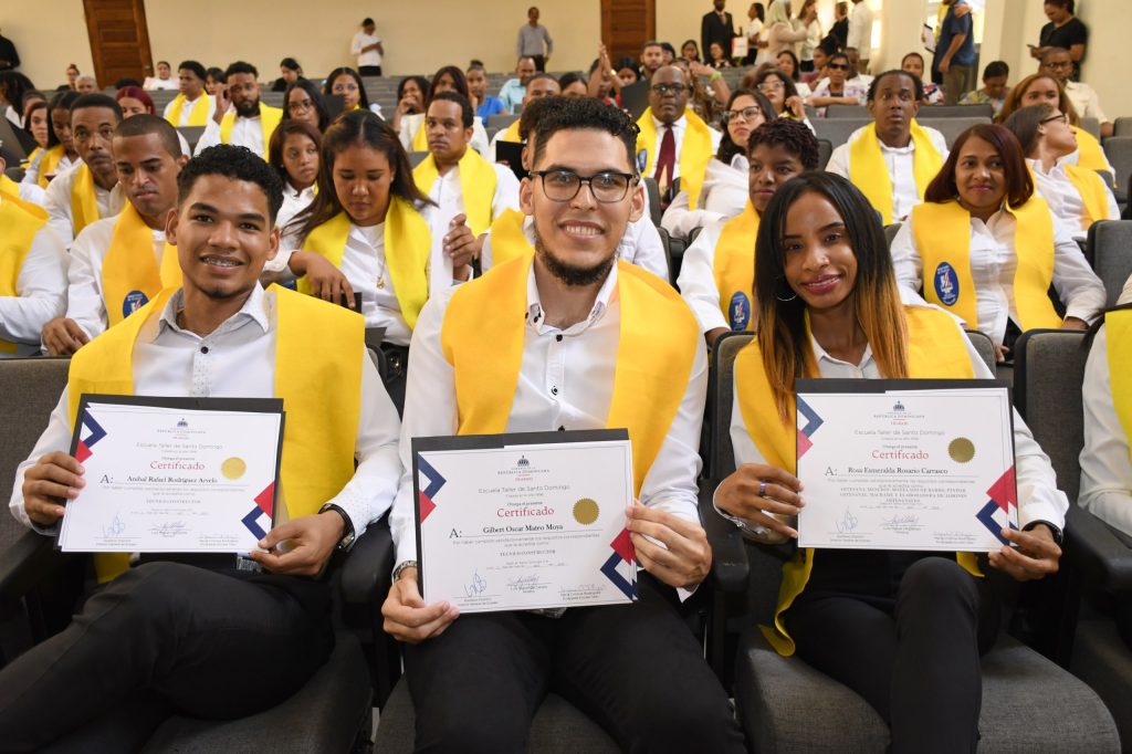 Santo Domingo. – Con la presencia de la primera dama de la República, Raquel Arbaje y el ministro de Trabajo Luis Miguel De Camps García, la Escuela Taller de Santo Domingo del Ministerio de Trabajo graduó 186 jóvenes en distintas áreas técnicas, dotándoles de las herramientas que les permitirán insertarse en el mercado laboral.