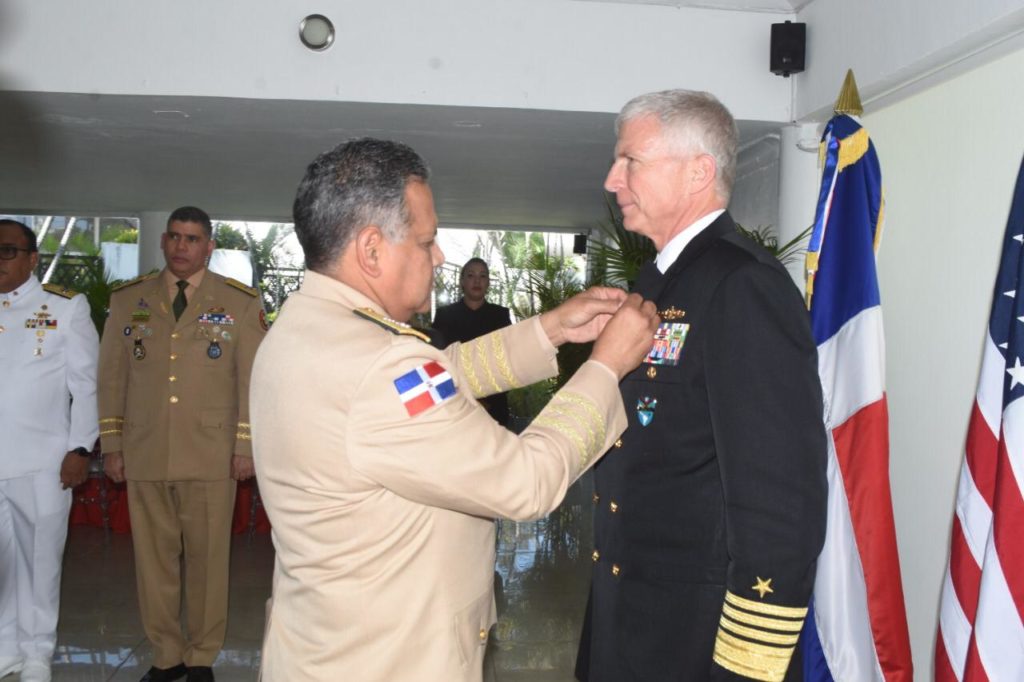 SANTO DOMINGO, RD.- El Ministro de Defensa Teniente General, ERD, Rubén D. Paulino Sem entregó al Comandante del Comando Sur del Ejército de Estados Unidos, Almirante Craig S. Faler USN, condecoración Orden al Merito Naval, en medalla “Servicio Distinguido”, concedida por el Presidente Danilo Medina mediante el decreto 389-19.