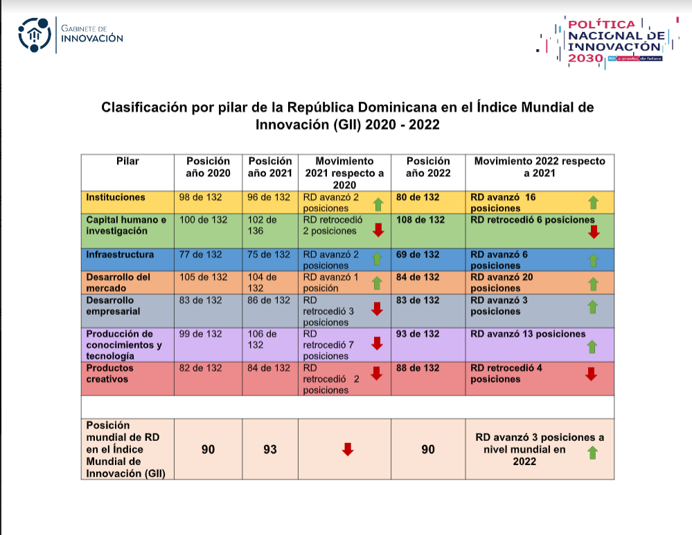 De acuerdo con el Índice Mundial de Innovación 2022 realizado por la Organización Mundial de la Propiedad Intelectual (OMPI), la República Dominicana presenta notables avances en las áreas evaluadas con relación a períodos anteriores.