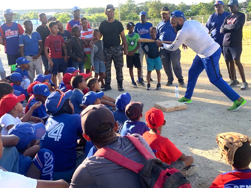 El estelar pelotero de los Tigres del Licey, Emilio Bonifacio, impartió una clínica-charla a niños de 6 ligas que practican en el complejo deportivo que construye la Policía Nacional en el vulnerable sector La Zurza con apoyo público privado .