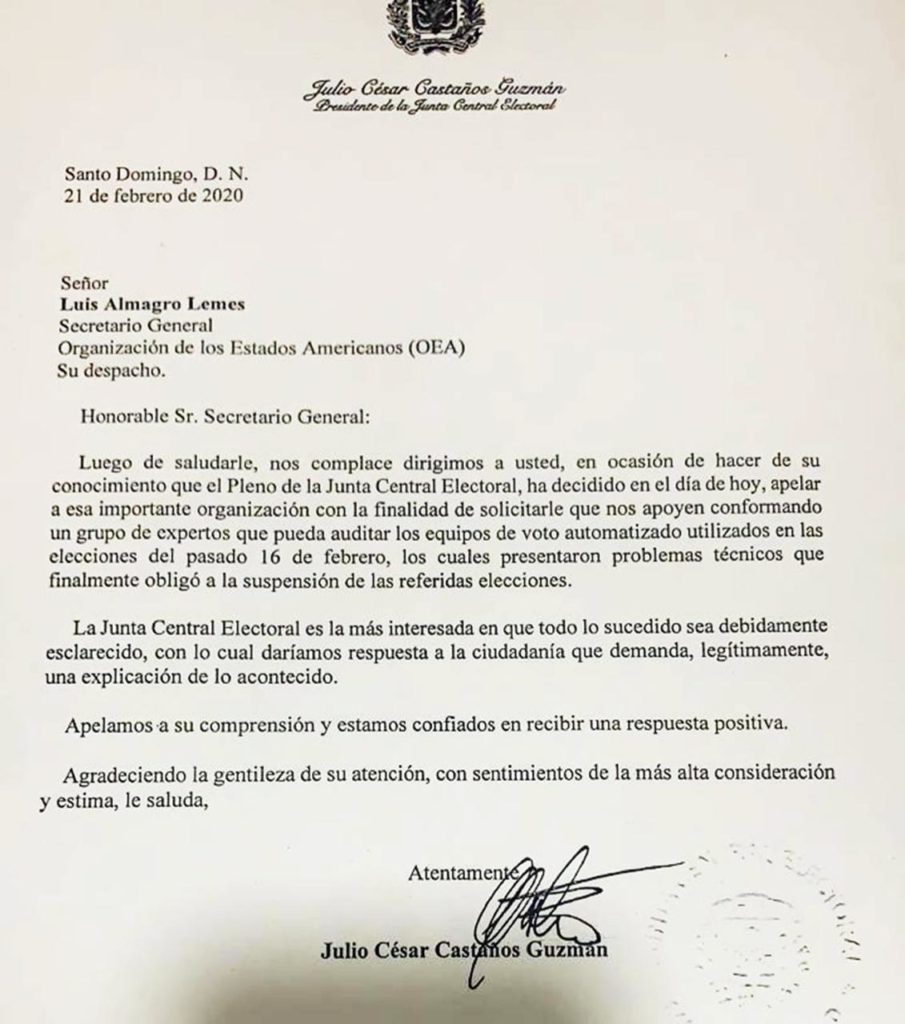 Santo Domingo, RD.-  El Pleno de la Junta Central Electoral (JCE), encabezado por su Presidente, Magistrado Julio César Castaños Guzmán, solicitó este viernes el apoyo a la Organización de los Estados Americanos (OEA) para conformar un equipo de técnicos que puedan auditar los equipos del Sistema de Voto Automatizado utilizado en las elecciones municipales del pasado domingo 16 de febrero, los cuales presentaron problemas técnicos que obligaron la suspensión de dicho proceso de elecciones.