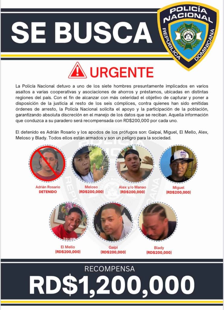 La Policía Nacional anunció este domingo que otorgará una recompensa de RD$200,000 a la persona que ofrezca información que conduzca a capturar a siete hombres, uno implicado en un homicidio ocurrido en la bomba Shell, del ensanche La Fe, y otros seis por formar parte de una peligrosa banda dedicada a asaltar cooperativas de ahorros y préstamos en distintas regiones del país.