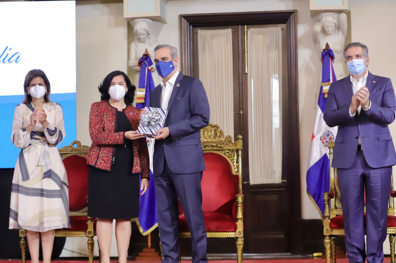 Carmen Checo entregó un compacto de Biblias en lenguaje de señas al presidente Abinader y a la vicepresidenta Raquel Peña.